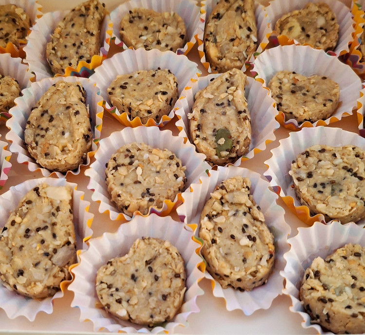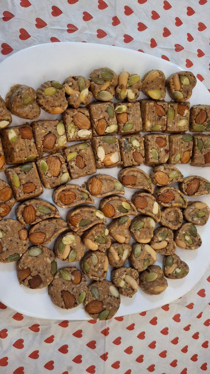 شامل جو دو سر پرک ، خرما ، کره بادام زمینی ، گردو ، ارده کنجد ، بادام زمینی، کنجد ، دانه چیا